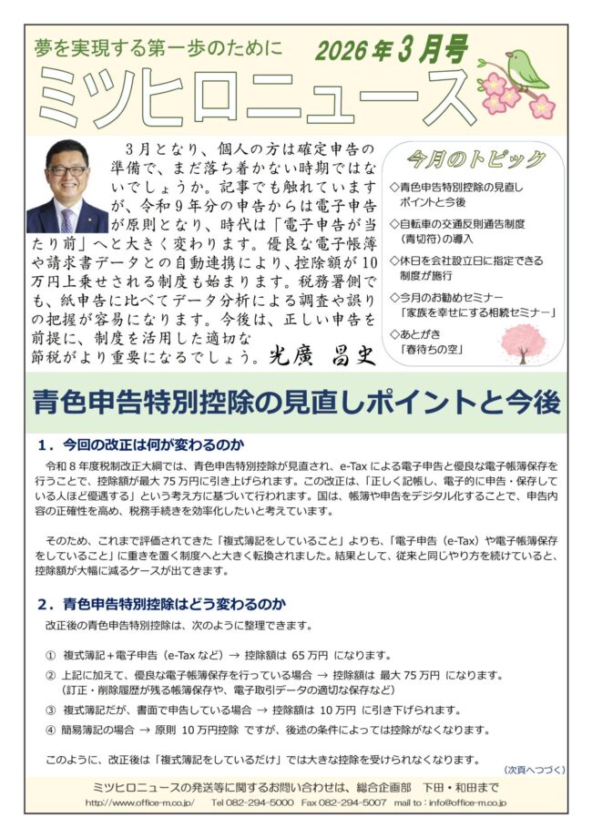 ミツヒロニュース3月号を発行しました。 今月のトピックス ①青色申告特別控除の見直しポイントと今後 ②自転車の交通反則通告制度(青切符)の導入 ③休日を会社設立日に指定できる制度が施行 ④今月のおすすめセミナー ⑤春待ちの空 ①青色申告特別控除の見直しポイントと今後 令和8年度税制改正大綱では、青色申告特別控除が見直され、e-Taxによる電子申告と優良な電子帳簿保存を行うことで、控除額が最大75万円に引き上げられます。 今回の改正ポイントと今後について解説していきます。 詳細については、P…