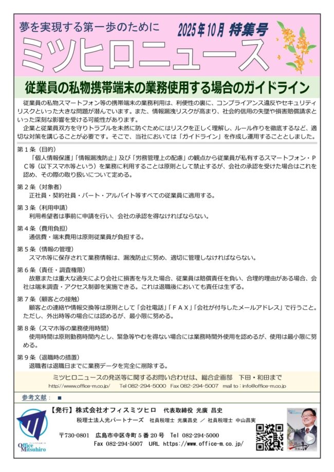この度、ミツヒロニュース10月特集号「従業員の私物携帯端末の業務使用する場合のガイドライン」を発行しました。従業員の私物スマートフォン等の携帯端末の業務利用は、利便性の裏に、コンプライアンス違反やセキュリティリスクといった大きな問題が潜んでいます。企業と従業員双方を守りトラブルを未然に防ぐためにはリスクを正しく理解し、ルール作りを徹底するなど、適切な対策を講じることが必要です。そこで、当社においては「ガイドライン」を作成し運用することとしました。