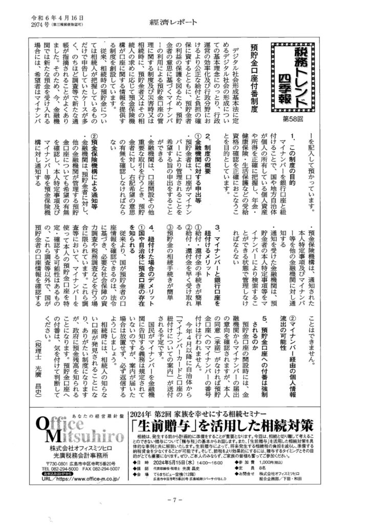 「税務トレンド四季報」を書かせていただいております。 このたび、経済レポート2024年4月16日 第2974号に「預貯金口座付番制度」を テーマとした記事が掲載されましたので、ご紹介いたします。ぜひ、ご覧になってください。 税理士 光廣 昌史