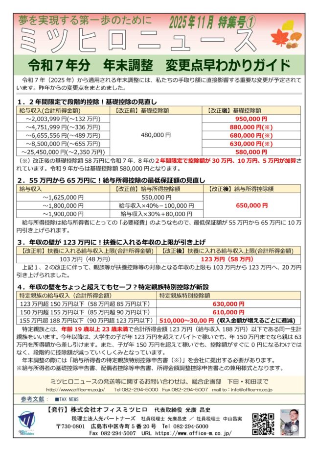 この度、ミツヒロニュース11月特集号①「令和7年分 年末調整 変更点早わかりガイド」を発行しました。令和7年(2025年)から適用される年末調整には、私たちの手取り額に直接影響する重要な変更が予定されています。昨年からの変更点をまとめました。