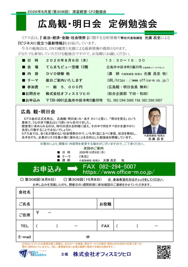 ミアス会の正式名称は、広島観・明日会(ひろしまみ・ あすかい)と言い、「明日を見る」という意味で、『心の目で観る』という思いから名付けました。経営者に求められるのは、時代の流れを的確に捉え、その中で何をすべきかを速やかに決定し行動することではないでしょうか。