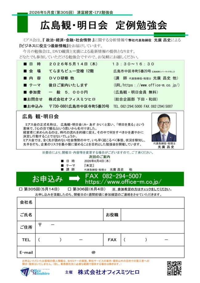 ミアス会の正式名称は、広島観・明日会(ひろしまみ・ あすかい)と言い、「明日を見る」という意味で、『心の目で観る』という思いから名付けました。経営者に求められるのは、時代の流れを的確に捉え、その中で何をすべきかを速やかに決定し行動することではないでしょうか。