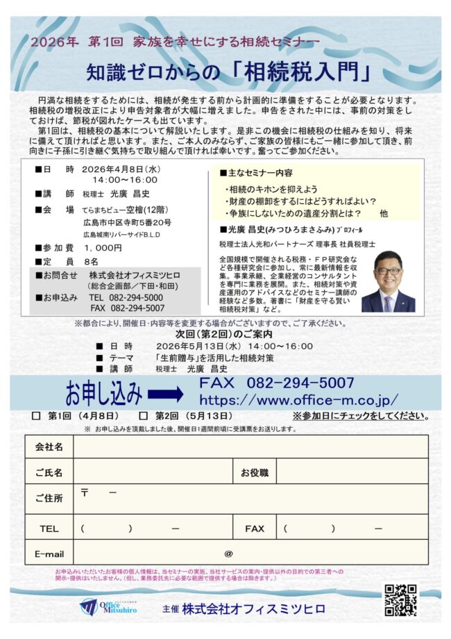 第1回は、相続税の基本について解説いたします。是非この機会に相続税の仕組みを知り、将来に備えて頂ければと思います。また、ご本人のみならず、ご家族の皆様にもご一緒に参加して頂き、前向きに子孫に引き継ぐ気持ちで取り組んで頂ければ幸いです。奮ってご参加ください。