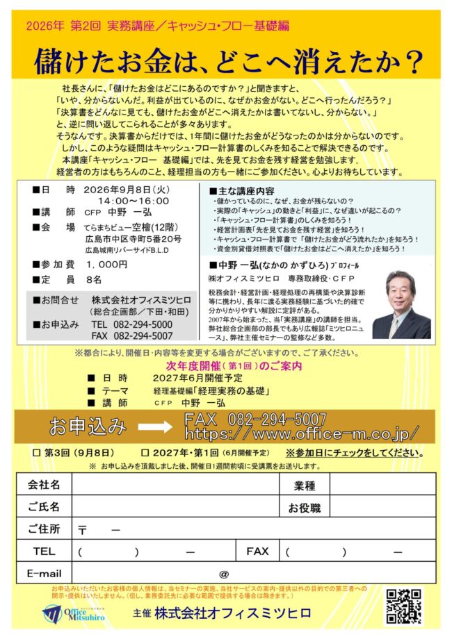 本講座「キャッシュ・フロー 基礎編」では、先を見てお金を残す経営を勉強します。経営者の方はもちろんのこと、経理担当の方も一緒にご参加ください。心よりお待ちしています。