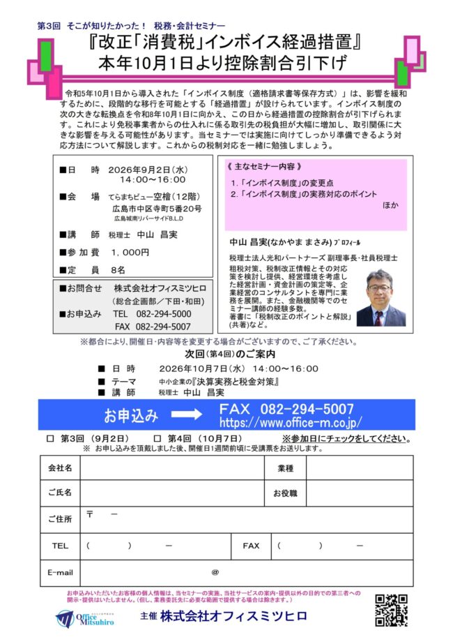 法人税や消費税の特例は選択適用や事前申請等「知っていれば得をする」が、「知らなければ損をする」ものがばかりです。後からその事実を聞いても適用できないことも多々あります。その為には情報を収集し理解することが必要です。一緒に勉強しましょう。皆様のご参加をお待ちしております。