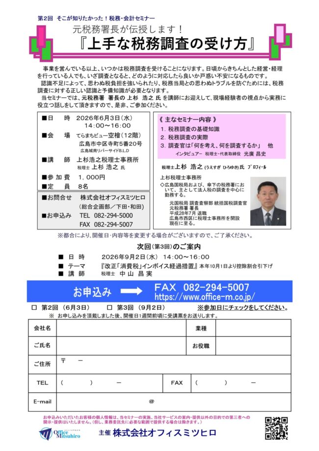 当セミナーでは、元税務署署長の上杉浩之氏を講師にお迎えして、現場経験者の視点から実務に役立つ話しをして頂きますので、是非、ご参加ください。